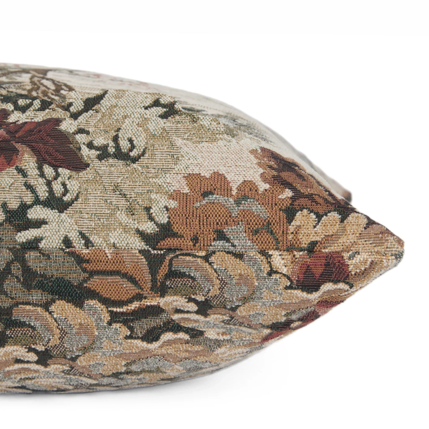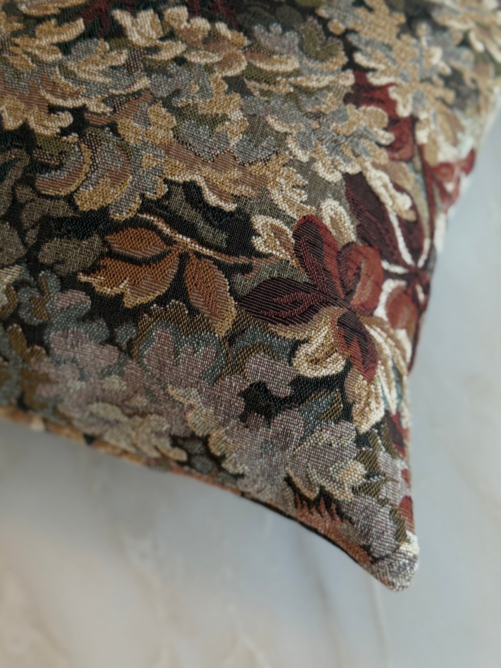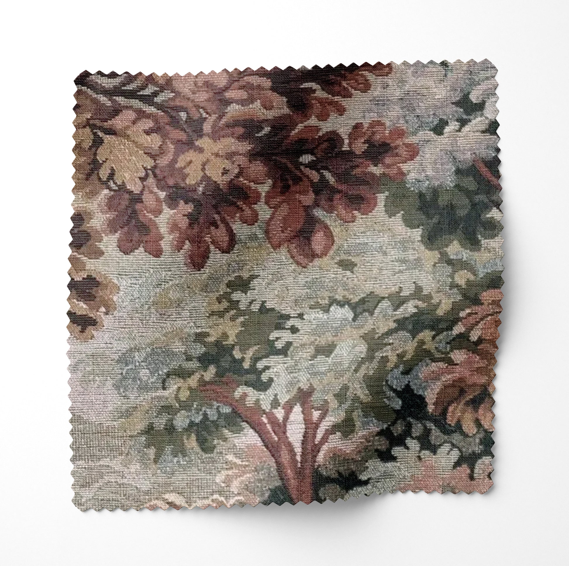 Woven jacquard textured tapestry fabric in shades of burgundy, sage, and ivory.
