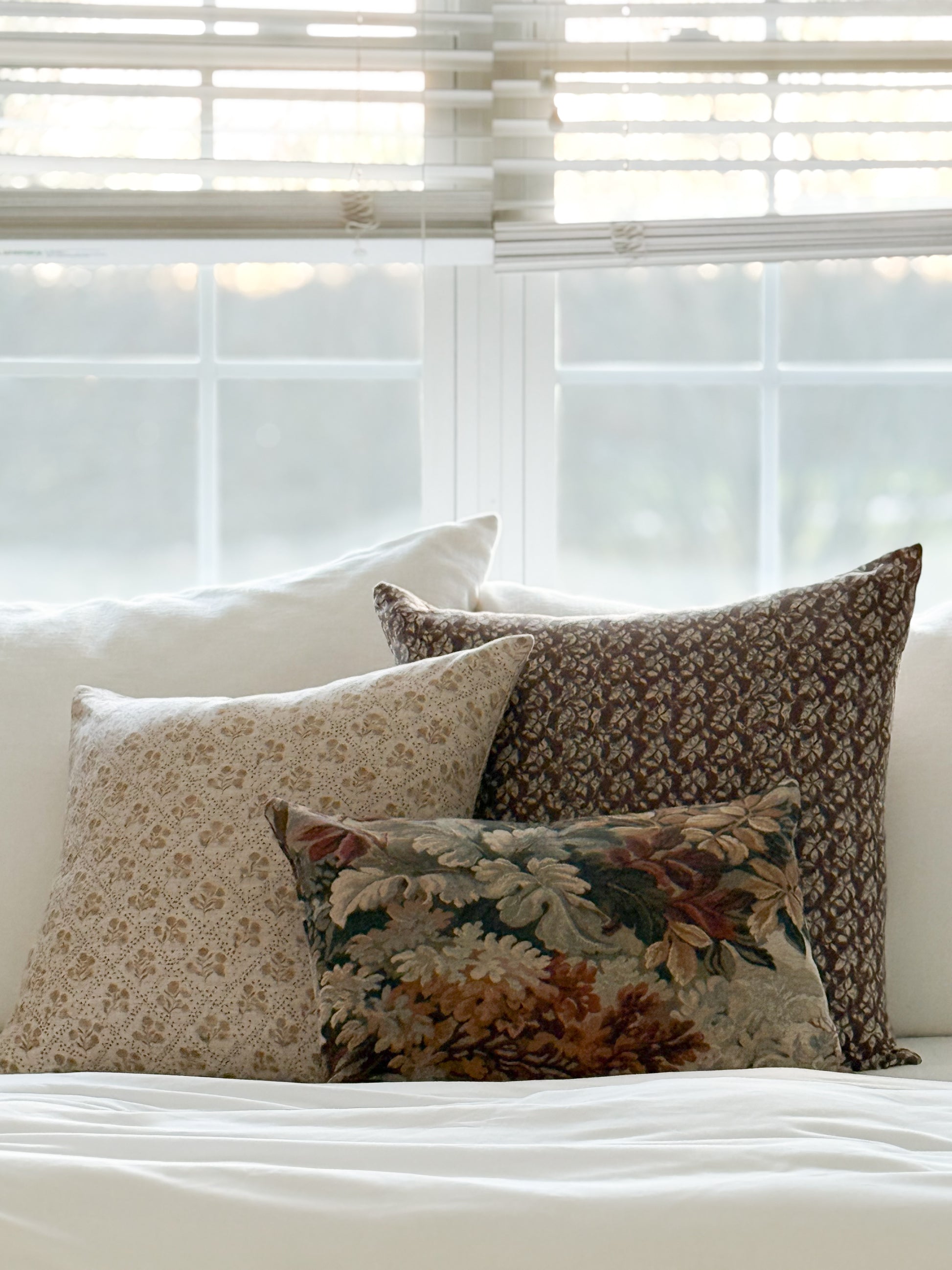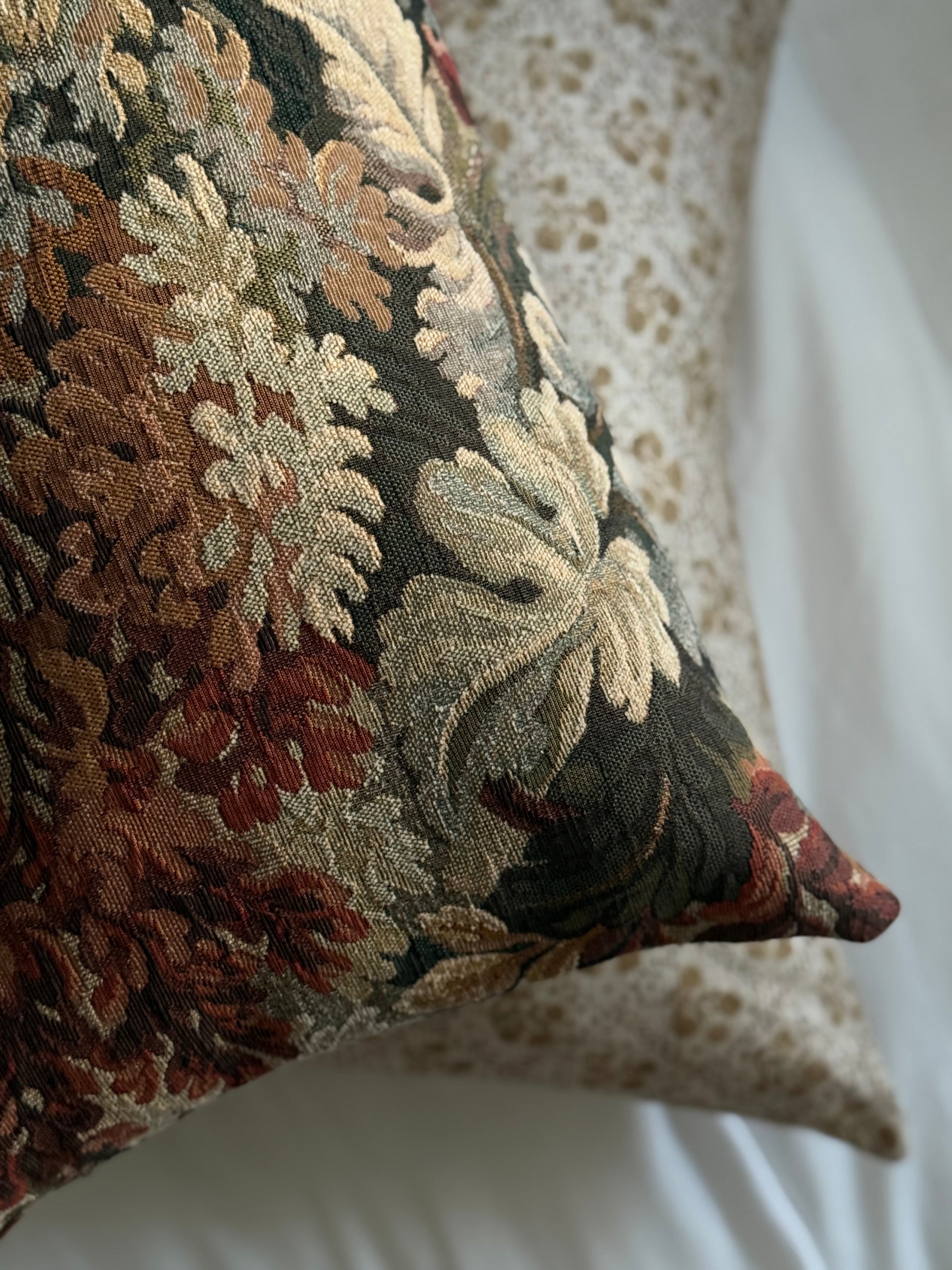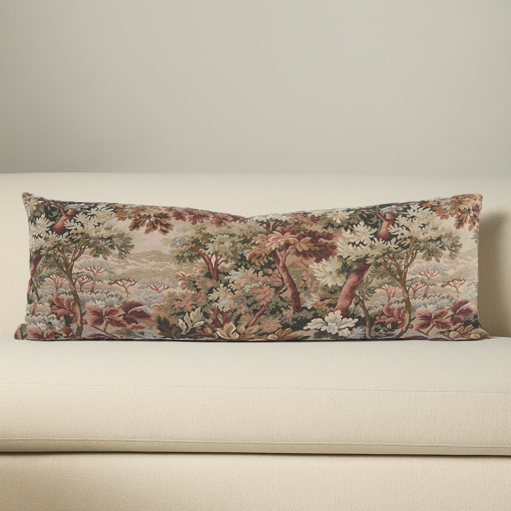 Woven jacquard textured tapestry fabric in shades of burgundy, sage, and ivory.
